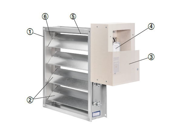 Specially designed safety component. Units consist of a casing, movable blades and linkage. Special side seals take up and compensate for the longitudinal expansion of the component at temperatures up to 400 °C for 120 minutes.